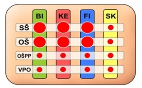 V osnovi projekt predstavljajo štirje stebri po vertikali in štirje stebri po horizontali (slika 2). Vsa štiri področja (biologija, kemija, fizika, skupni predmeti) se raztezajo od najnižje stopnje pa vse do srednjih šol (vrtci, osnovne šole s prilagojenim programom, osnovne šole, srednje šole). Slika 2 prikazuje, da je večji poudarek pri projektu predvsem na treh glavnih področjih, na biologiji, kemiji in fiziki, manj na skupnih predmetih, ki so bolj podporni k naravoslovnim, prav tako pa je večji poudarek na osnovnih in srednjih šolah, manjši na vrtcih in osnovnih šolah s prilagojenim programom. Slovenskemu šolskemu naravoslovju se je z našim projektom ponudila edinstvena priložnost, da naredi pomemben korak naprej, korak, ki bo vnesel podoben zagon, kot ga je pred leti v osnovnošolskem naravoslovju povzročil projekt TEMPUS. Zagotovilo za to je dejstvo, da so v tem projektu sodelovali vzgojitelji in učitelji praktiki skupaj s tremi univerzami in več drugimi pomembnimi institucijami, ki so v Sloveniji povezane z naravoslovnim izobraževanjem in izobraževanjem učiteljev, kar hkrati tudi pomeni, da lahko vse, kar smo sklenili, uvedemo usklajeni po vsej šolski vertikali.